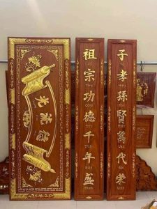 Cuốn thư câu đối gỗ là vật phẩm trang trí cho gian thờ thêm phần sang trọng và linh thiêng. Nhìn vào bộ hoành phi gỗ với mẫu mã, hoa văn tỉ mỉ, tinh tế ta thấy được vẻ đẹp hoài cổ như gian thờ thời xưa của ông cha ta. Bộ cuốn thư câu đối bằng gỗ thể hiện được gia phong của gia đình, dòng tộc, mang chuẩn mực, lối sống của người Việt ta